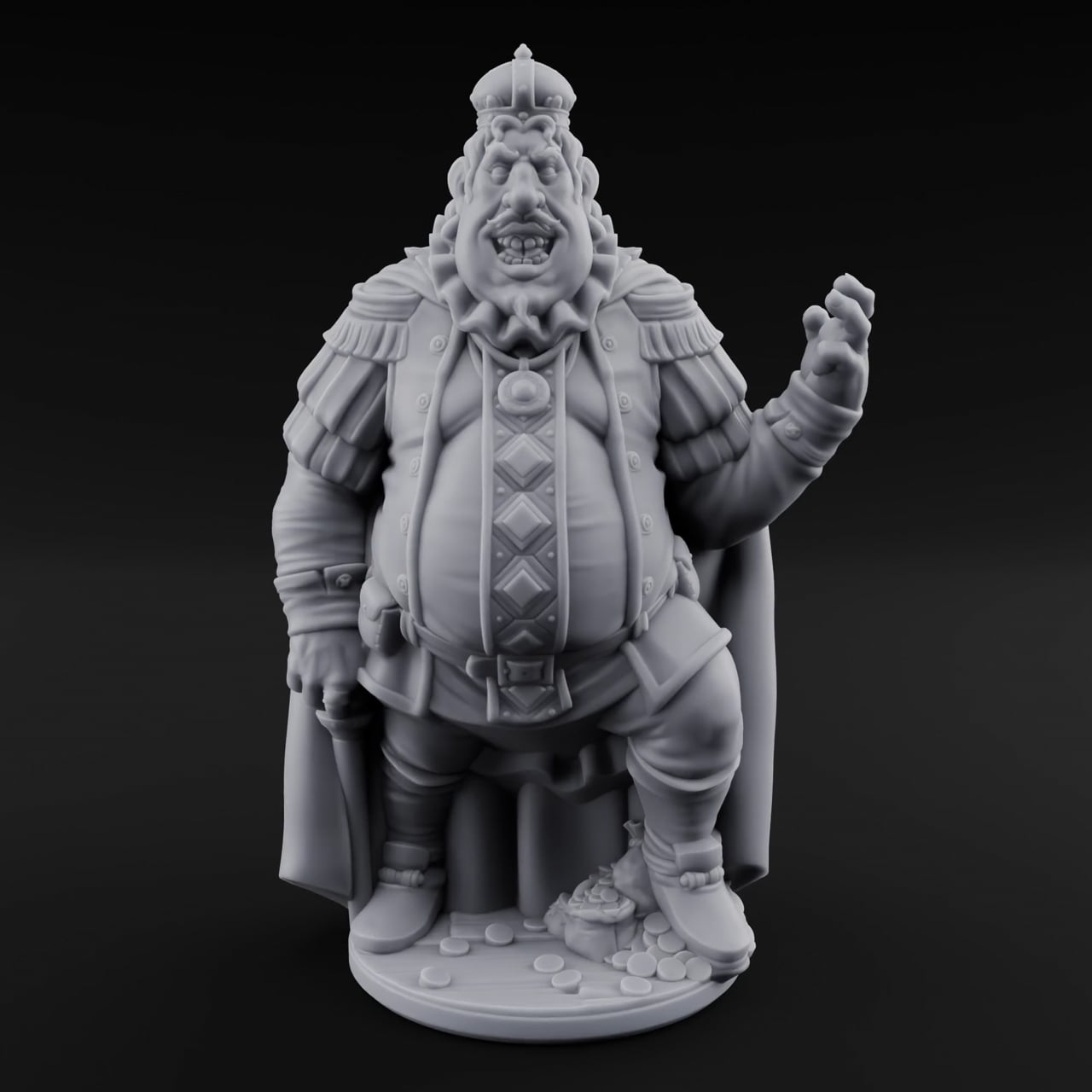 Draped in a regal military coat with fringed epaulettes and a jeweled crown perched atop his massive skull, this ogre monarch radiates brutal entitlement. His swollen belly strains against a diamond-patterned vest while one meaty fist clutches a cleaver and the other gestures dismissively. A spilled sack of coins at his feet speaks to plundered fortunes, and a forked beard frames his sneering, gap-toothed grin.