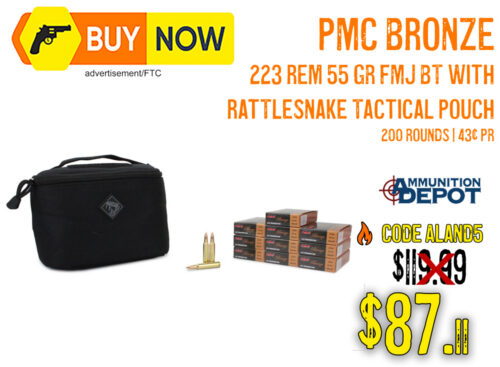 Limited Time DealGet 200 rounds of dependable PMC Bronze .223 plus a rugged Rattlesnake Tactical pouch marked down to $87.11 with code ALand5. That is 43¢ per round. Top Features200 Rounds of PMC Bronze .223 Rem 55gr FMJ-BT (10 boxes)Reloadable brass casings for smooth feeding & easy reloadingBoat-tail FMJ bullets for consistent accuracy2900 FPS muzzle velocity / 1250 ft-lbs energyIncludes Rattlesnake Tactical Ammo Pouch (8.5″ x 6″ x 6″) w/ American Flag PVC patchWhy Shoote